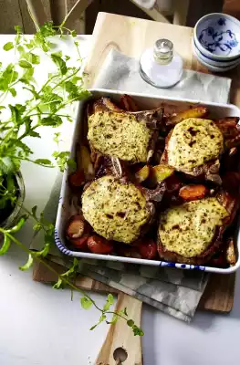 Wash the chops, dab dry and season with salt and pepper. Heat clarified butter in a large frying pan and fry the chops for about 2 minutes on each side. Place on the potato mixture and spread the mustard cream on top (see