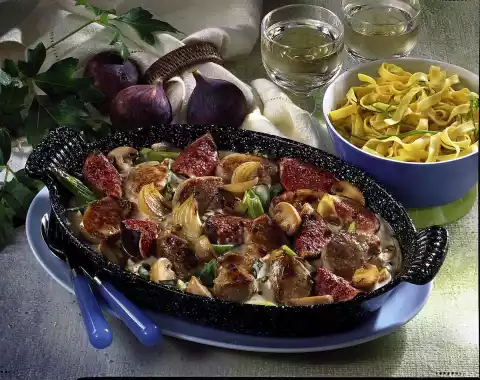 Season to taste with salt and some pepper. Wash and quarter the figs. Fill mushrooms, meat and all onions into a large (1 3/4 - 2 litres capacity) casserole dish. Pour sauce over it. Bake in a preheated oven (electric: 200 °C/ gas: level 3) for another 15-20 minutes. Serve with fine ribbon noodles garnished with chives
