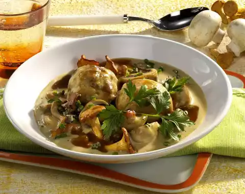 Shape the dumpling mixture into 8 dumplings with wet hands. Cook in boiling salt water for about 15 minutes. Serve in portions with the creamed mushrooms. Serve garnished with parsley.
