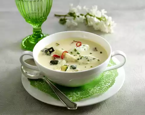 Season to taste with salt, pepper and sugar. Add the zucchini cubes and asparagus pieces and warm them up. Serve the soup. Cut off the goat's cheese nocks, add to the soup and garnish with chive rolls.