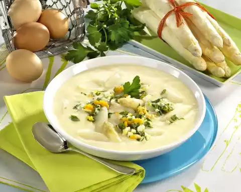 Boil the eggs in boiling water for about 8 minutes. Pour the asparagus stock through a sieve. Heat the oil in a pot and fry the onion. Deglaze with stock, bring to the boil and cook the asparagus for about 15 minutes. Wash parsley, dab dry and chop finely. Quench eggs cold, peel and dice finely. Mix egg cubes and parsley. Stir the crème légère into the soup, bring to the boil and stir in the sauce thickener. Let simmer for about 2 minutes. Season soup with salt, pepper and 1 pinch of sugar.