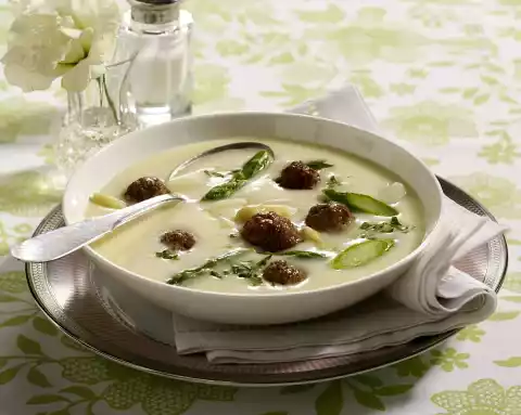 Add the asparagus and chopped dumplings. Wash parsley, dab dry and cut into strips. Add to the soup. Arrange in plates.