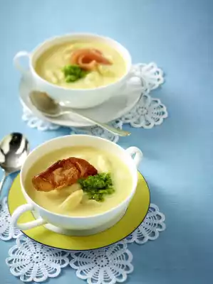 Heat 2 tablespoons of oil in a frying pan, halve the Tyrolean bacon and fry until crispy in the hot oil. Drain on kitchen paper. Cut salmon into strips. Peel onion and dice very finely. Melt the fat in a pot. Sauté onion until translucent, dust with flour and sauté. Gradually deglaze with asparagus stock and cream and bring to the boil again and again. Season to taste with salt, pepper, stock and sugar