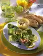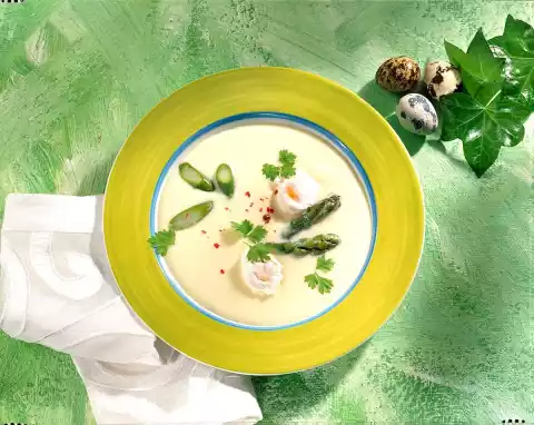Boil up the asparagus stock again. Cook the asparagus pieces for about 5 minutes and drain again. Collect the stock. Heat the fat. Sauté the flour in it. Add cream, white wine and asparagus stock while stirring constantly and bring to the boil. Heat the asparagus pieces (only green ones in the photo!!!) in it. Season soup to taste. Boil up plenty of water with vinegar. Beat quail eggs one by one in a ladle and carefully slide them into the slightly boiling vinegar water. Poach for 2-3 minutes and remove with a ladle.