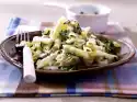 Remove about 2/3 of the broccoli florets with a skimmer. Finely puree the rest in the soup with a hand blender. Stir in crème fraiche. Season soup with salt, pepper and nutmeg. Divide the remaining broccoli into even smaller florets.