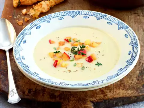 Finely dice the rest of the parsnip. Wash the apple, remove seeds and dice finely. Fry both in 1 tbsp. hot oil. Stir the cream into the soup, puree. Season with salt, pepper and nutmeg. Sprinkle the cubes with 1 tsp. sugar, caramelise and sprinkle on the soup.