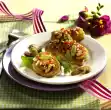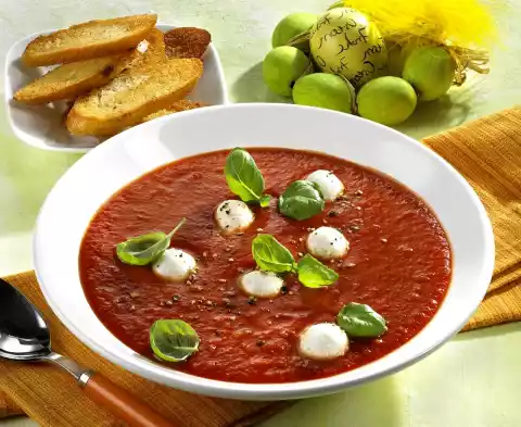 Add garlic and basil and fry briefly. Add tomato paste and sweat. Deglaze with tomatoes and stock, bring to the boil. Simmer at low heat for about 5 minutes. Season to taste with salt, pepper, paprika and sugar. Fill into plates, spread mozzarella in it, sprinkle with pepper and garnish with basil. Add roasted baguette slices extra