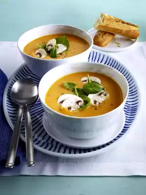 Puree the soup and add the cream. Bring to the boil again and season to taste. Wash spinach and shake dry. If necessary, clean and slice the mushrooms thinly.