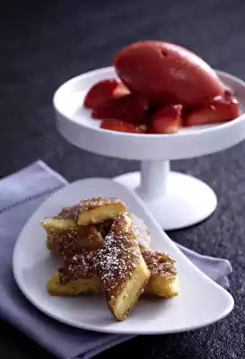 For the sorbet, quickly puree the thawed strawberries, 1 tbsp. icing sugar, lemon juice and Prosecco into a sorbet. Use a tablespoon to cut off 4 large cams from the sorbet (if necessary, refreeze the rest of the sorbet). Arrange with the strawberries and serve to the Schmarrn