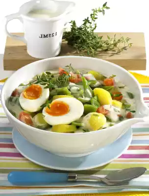Add cream and bring to the boil. Put eggs in boiling water and boil for 8 minutes. Knead flour and fat. Stir flour dumpling into the stock and bring to the boil. Season cream potatoes with salt, pepper and nutmeg.