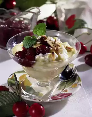 Separate the egg. Stir the egg yolk into the pudding. Beat the egg white until stiff and fold in as well. Pour the pudding into dessert bowls and let it cool down. Spread cherries on top. Roast the almonds without fat, let them cool down. Sprinkle the almonds over the pudding and decorate with lemon balm if desired.