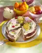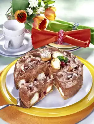 Take the cream puff out of the package, put 2 aside and place the rest on the cream. Put some cherries aside for decoration, spread the rest between the cream puffs. Spread the rest of the cream on top in a wavy pattern. Put the cake in a cool place for about 2 hours. Peel the curls from the chocolate with a peeler. Remove the edge of the mould. Place the remaining cream puffs and cherries on top and decorate with chocolate curls and mint leaf. Dust with icing sugar