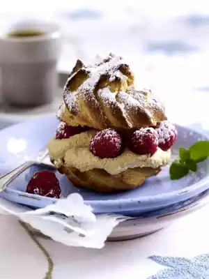 Select the berries and wash them if necessary. Whip cream and espresso powder until stiff, adding sugar and vanillin sugar. Pour into a piping bag (large perforated nozzle). Spray half the cream spirally onto the cream puff bases.