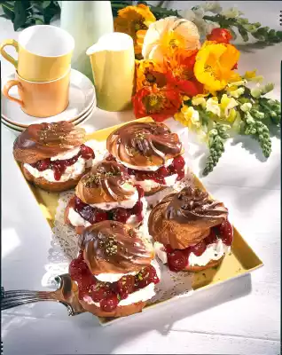 Stir eggs one after the other with a wooden spoon into the brandy. (Each egg must have completely bonded with the mass before the next egg is added). Pour the choux pastry into a piping bag with a large star-shaped spout. Cover 2 baking trays with baking paper, squirt 5 cream puffs on each tray and bake in the preheated oven (electric oven: 225 ° C/ gas: level 4) one after the other for 30-35 minutes. Then let them cool down briefly and cut open the cream puffs with scissors. In the meantime, drain the cherries. Measure 350 ml juice and bring to the boil with the remaining sugar. Mix the pudding powder with 2 tablespoons of water until smooth and thicken the cherry juice with it. Stir in the cherries and let it cool down. Chop the chocolate coating and coconut oil, melt in a hot water bath and stir until smooth. Dip the cream puff lids into it and let them set.