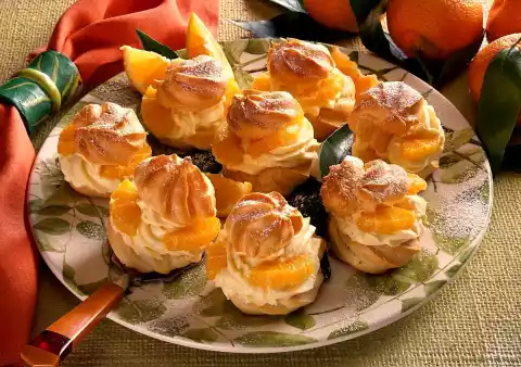 Pour into a piping bag with a star-shaped spout and fill into the cream puffs with it. Peel and slice the mandarins, cut them into quarters and put them into the cream filling. Place the lid on the cream puffs and chill the pastry for 30 minutes.
