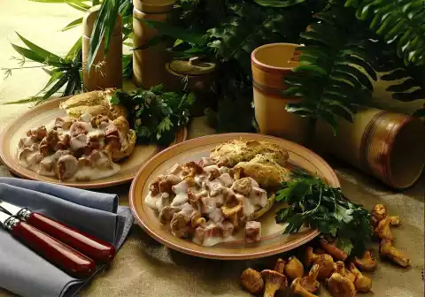 Add tongue and warm in the sauce. Fold in chanterelles. Remove cream puffs from the oven and cut open immediately. Fill with the tongue chanterelle ragout and serve.