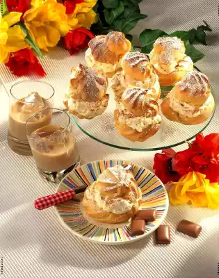Pour the choux pastry into a piping bag with a large star-shaped spout. Spray 12 dough patches at some distance on a baking tray lined with baking paper. Bake in the preheated oven (electric cooker: 225 ° C/ gas: level 4) for 30-35 minutes. Remove cream puffs from the oven, immediately cut off the lids with scissors and let everything cool down on a cake rack. In the meantime, roughly chop Daim sweets. Whip the cream until stiff, allowing the remaining vanillin sugar and cream setting agent to trickle in. Carefully stir in whisky cream liqueur and chopped sweets. Fill the cream with a tablespoon into the lower halves of the cream puffs and place the lids on top. Mix icing sugar and cocoa and dust the cream puffs with it.