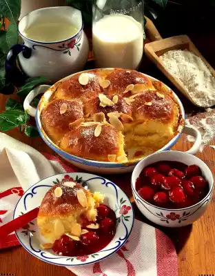 Cover the cake after half the baking time. Roast almonds in a dry pan and sprinkle over the Buchteln before serving. Serve again sprinkled with a little sugar as desired. Add stewed cherries extra.