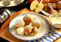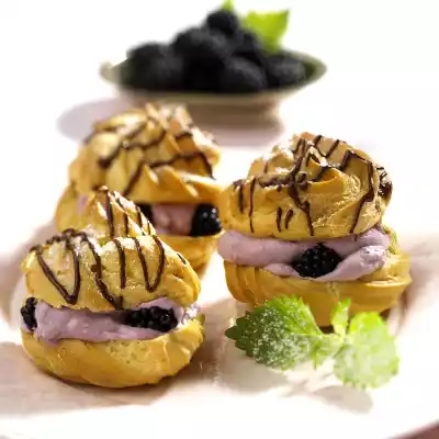 Pour the dough into a piping bag with a star-shaped spout and spray tuffs (6 cm Ø) onto 2 baking trays lined with baking paper. Bake the tuffs one after the other in a preheated oven (electric cooker: 200 °C/ convection oven: 175 °C/ gas: level 3) for approx. 15 minutes. Do not open the oven door. Remove the cream puffs and cut them in half immediately with scissors. Let it cool down. Sort the blackberries, wash carefully and drain well. For the red wine cream, whip cream until stiff. Put the red wine (included in the package) and 6 tablespoons of water (both at room temperature) into a fat-free mixing bowl. Add the dessert powder and whisk briefly with the whisks of the hand mixer on the lowest setting. Then whisk at highest setting for 2 minutes until the mixture becomes frothy and thick. Using the hand mixer on the lowest setting, briefly stir in the stiffly whipped cream.