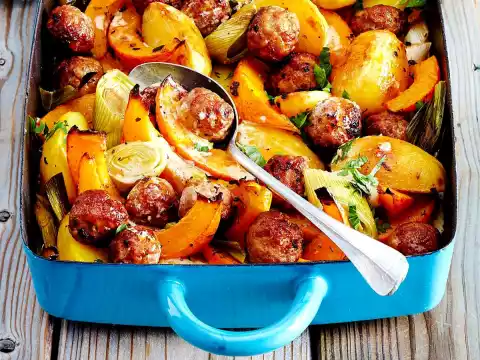 Spread the meatballs over the vegetables. Deglaze the gravy with cream, bring to the boil briefly and pour over the vegetables. Braise in the preheated oven on the lower shelf (electric cooker: 200 °C/ circulating air: 175 °C/ gas: see manufacturer) for approx. 45 minutes.