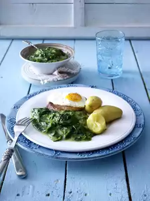 Heat clarified butter in a frying pan, beat the eggs one after the other, let them slide in and fry them at medium heat for about 2 minutes. Season with salt and pepper. Arrange meat with egg, spinach and potatoes on plates.