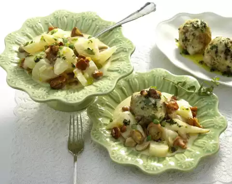 Fry half of the onion in it and add chopped marjoram. Put onion on the rolls, add eggs and knead. Season with salt and pepper. Form 12 dumplings from the dough. Bring a wide saucepan of salted water to the boil, add dumplings and let them simmer at low heat for about 20 minutes. Peel the turnips and cut into pieces. Put the turnips in 3/8 litres of boiling salted water and cook for about 10 minutes, drain. In the meantime carefully wash, drain and clean the chanterelles. Clean and shine the mushrooms. Heat 3 tablespoons of fat in a pan. Fry the mushrooms and remaining onion in it for 3-4 minutes. Season with salt and pepper.