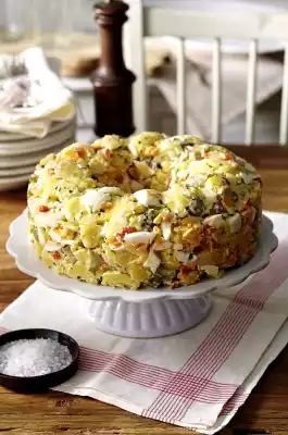 Fill the salad into a springform pan (26 cm Ø) with a tube bottom insert and press well. Cover and leave to cool overnight. Remove from the refrigerator about 1 hour before serving. Turn out onto a large platter just before serving.