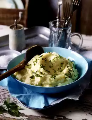 Wash parsley, shake dry, pluck leaves from the stalks and chop finely. Drain the cauliflower, let it drain briefly. Add double cream and butter and puree finely. Season to taste with salt and nutmeg.