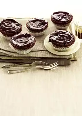 Line the troughs of a muffin tin (12 troughs) with paper cups. Bring milk to the boil, remove from the stove. Cream butter, sugar and vanilla sugar. Stir in eggs one after the other. Mix cocoa, baking powder and flour, sieve onto the buttercream and stir in. Add milk and stir in briefly