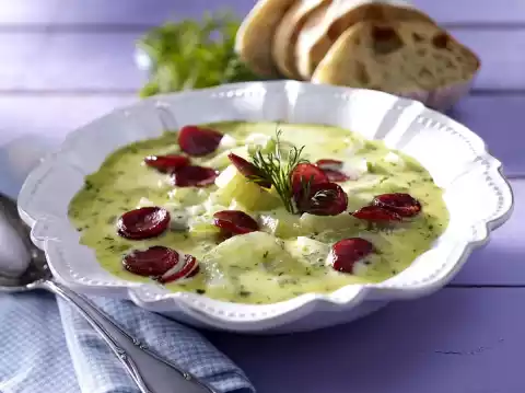 Wash the dill, shake dry and cut finely. Take almost half of the cucumber out of the soup and puree the rest. Stir in crème fraiche and dill. Add cucumber and sausage again. Season soup with salt and pepper.