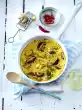 Rub the mushrooms with kitchen paper or clean them with a brush. Halve the mushrooms. Clean the peppers, cut them in half lengthwise, remove the seeds and wash them. Cut into thin strips. Peel onion and garlic, chop both.