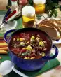 Add onion to bacon and fry until transparent. Add potatoes and carrots, fry briefly. Add 2 litres of water. Add peas, bring to the boil. Cover and cook over low heat for 1 1/4 - 1 1/2 hours. Peel sausage and cut into small cubes. Cut bread also into small cubes. Peel and chop 1 onion. Wash parsley, dab dry and chop finely. Heat half the oil and butter in a large frying pan. Fry half the sausage, bread and onion for 4-6 minutes, turning several times. Drain on kitchen paper.