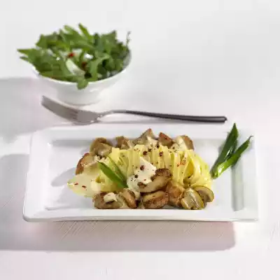 Fry the garlic paste, spring onions and mushrooms in the cooking fat. Deglaze with wine, stock and cream. Add meat. Season to taste with salt and pepper. Bring to the boil and let it boil down for about 10 minutes.