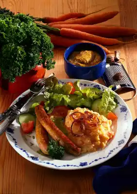 Mix milk and sour cream, heat carefully and stir into the chunky puree. Season to taste with salt, pepper and nutmeg. Carefully mix prepared salad ingredients and vinaigrette. Arrange salad, mashed potatoes and carrots and sausages on plates. Sprinkle puree with the onion rings. Serve the dish garnished with the parsley