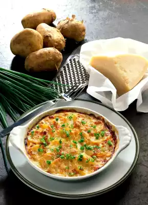Cut into slices and layer in a greased casserole dish. Grate the cheese and sprinkle over it. Whisk milk and cream. Season with nutmeg and pepper. Pour over the potatoes. Bake everything in the preheated oven (electric cooker: 200 °C/circulating air: 175 °C/gas: level 3) for about 30 minutes. Wash the chives, cut them into small rolls and sprinkle over them