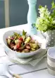 Wash the potatoes thoroughly, boil them in water and cook for about 20 minutes. Drain, quench and peel. Let the potatoes cool down and cut into slices. Peel and finely chop the onions. Bring stock and onions to the boil, add vinegar. Put potatoes in a large bowl and pour the broth-vinegar mixture over them. Season well with salt and pepper. Leave to stand for about 1 hour, mixing carefully several times. Put eggs in boiling water and cook for about 9 minutes. Drain, rinse and peel. Cut eggs into quarters or sixths. Clean, wash and put sugar snap peas in boiling salted water, bring to the boil and cook for 2-3 minutes. Drain, quench and drain well. Wash, clean and quarter the tomatoes. Clean, wash and cut lettuce into strips. Clean, wash and cut spring onions into rings. Cucumber clean, wash, cut off end. Halve cucumber lengthwise and cut into pieces. Wash chives, shake dry and cut into fine rolls. Add mangetouts, cucumber, tomatoes, spring onions, lettuce, chives and oil to the potatoes and mix in. Season again with salt, pepper and sugar. Carefully mix in the eggs. Arrange in a bowl