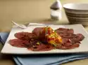 Stir the crème fraîche until smooth. Arrange the soup and add the crème fraîche in streaks. Add the radish bruschetta