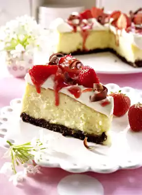 Remove the cake (caution, the base is soft and the cheese mixture is soft and creamy!) from the mould. Spread the cream loosely on top. Shortly before serving, scoop half of the strawberry puree onto the cream and pull it slightly through the cream using a teaspoon.