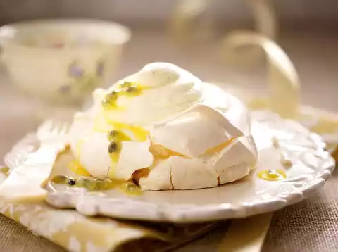 Cut the passion fruit in half, spoon out the flesh and stir. Whip the cream until stiff and fold into the cream. Pour into a piping bag with a large perforated spout and squirt onto the meringue.