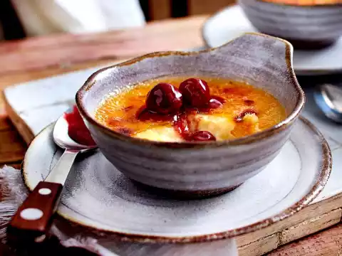 Remove the moulds and let them cool down. Sprinkle crème-brûlée portions with 1 tablespoon of sugar each. Caramelize with a kitchen gas burner until golden brown. Serve with 1-2 tbsp. cherries and add the remaining cherries.