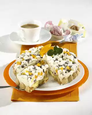 Crumble the meringue. Spread the edge of the cake with 100 g crème fraîche. Press 50 g Amarettini to the bottom edge. Decorate the cake with meringue, chocolate shavings, mint, mango wedges and cubes