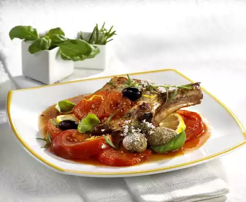 Add tomato slices, tomato paste and herbs. Deglaze with wine and 1/4 litre water. Stir in mustard. Cover and braise over high heat for about 10 minutes. Season with salt, pepper and a few drops of lemon juice. Arrange chops and potatoes in portions. Serve garnished with lemon, olives and fresh herbs.