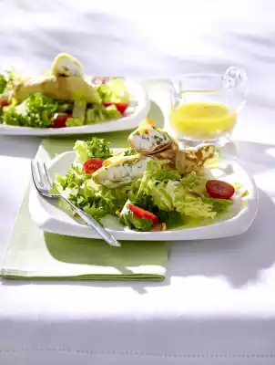 Spread a quarter of the cream cheese cream on one end of each crêpe, roll it up and cut it in half diagonally. Arrange lettuce and tomato halves on plates. Drizzle with vinaigrette and arrange the crêpe halves on top