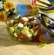 Wash salads and spin dry. Chop romaine lettuce leaves and 10-12 frisée leaves. Use the rest for other purposes. Wash and halve the tomatoes. Mix vinegar and mustard, season with salt and pepper. Add oil and stir in almond slivers