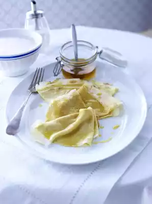 Heat a coated frying pan (28 cm Ø) and spread a thin layer of remaining oil in portions. Pour a little batter into the pan, spread quickly by tossing. Pour the excess dough over the edge of the pan and back into the bowl to form a wafer-thin layer of dough. Fry for 1-2 minutes until the bottom is brown. Fold the crêpe in the pan, first halve and then quarter it. Process the remaining dough in the same way, brushing the pan with a little oil each time before frying. Keep the finished crêpes warm in a preheated oven (electric range: 50 °C/ convection oven: not suitable/ gas: not suitable). Arrange the crêpes, dust with icing sugar and serve with lemon syrup