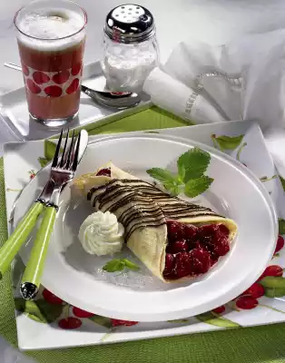 Mix flour, egg, milk and 1 pinch of salt to a smooth dough. Let the dough swell for about 5 minutes. Heat the fat in portions in a pan (approx. 16 cm Ø). Bake 4 thin crêpes from the dough one after the other. Keep the finished crêpes warm. Chop the chocolate and place in a freezer bag. Place the freezer bag in hot water. Melt the chocolate in the bag. Cut off a small corner. Whip the cream until stiff and allow the vanilla sugar to trickle in. Pour cream into a piping bag with a star-shaped spout.