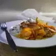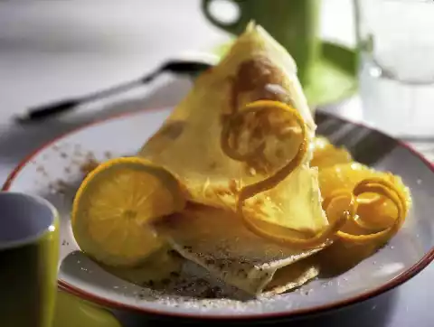 Briefly toss orange slices in the frying fat. Sprinkle crépes with sugar and cinnamon, add orange slices.