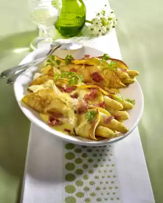 Finely chop the rest and stir into the sauce. Dice the smoked ham. Wrap 3 asparagus spears in one crepe each. Put them into a flat casserole dish. Pour chervil-hollandaise sauce over it and sprinkle with the ham.
