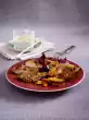 Spread plum sauce over the crêpes. Place meat, vegetables and nuts half on each crêpe. Fold over the half that is not covered and fold over again to make a quarter. Arrange on plates