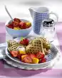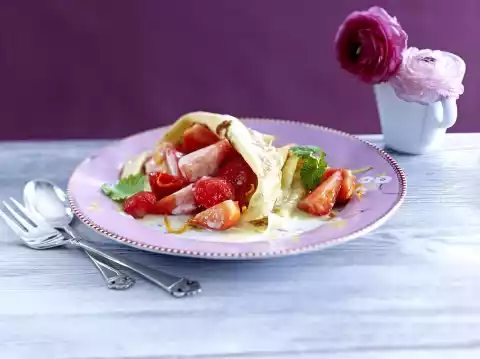 Grease a coated pan with some clarified butter. Pour in 1/4 of the dough and spread it thinly on the bottom of the pan by swinging it back and forth. Bake from both sides until golden brown. Bake 3 more crêpes from the remaining dough. Arrange the crêpes with strawberries on plates and drizzle with the sauce. Decorate with lemon balm